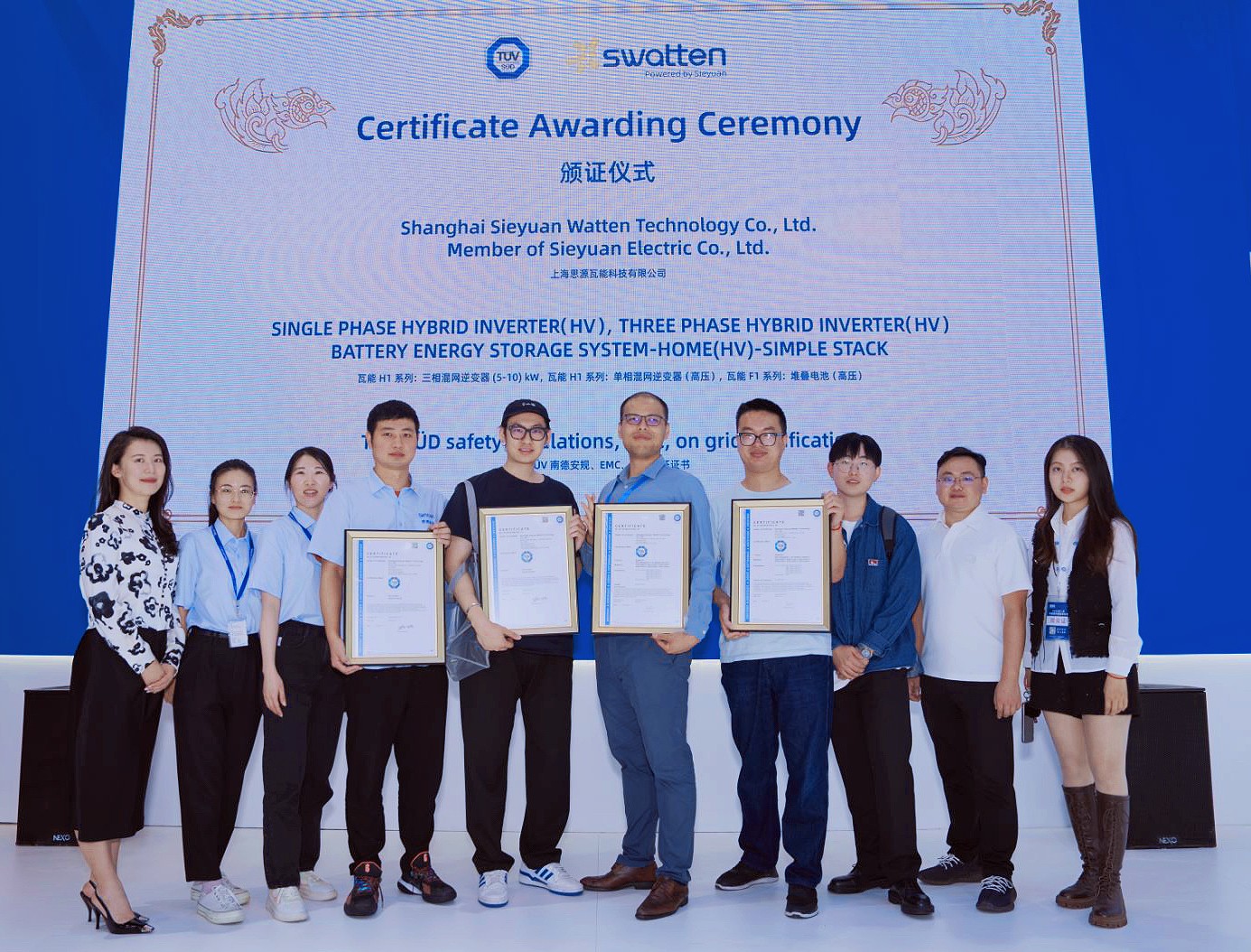 In Suzhou, China, on August 31, 2023, - TÜV SÜD New Energy Vehicle Testing (Jiangsu) Co.,Ltd. (referred to as "TÜV Süd") awarded safety and EMC certification certificates to Shanghai Sieyuan Watten Technology Co., Ltd. (referred to as "Swatten") for their single-phase hybrid grid inverter series of 3.6-6 kW and three-phase hybrid grid inverter series of 5-10 kW during the second China International Energy Storage Exhibition. In addition to safety and EMC certifications, TÜV Süd also granted grid connection certifications for Germany and Poland. The certification ceremony was attended by distinguished guests, including Mr. Zhao Kai, Manager of Smart Energy Technology at TÜV Süd, and Mr. Chen Bohai, Global Sales Director of Swatten.